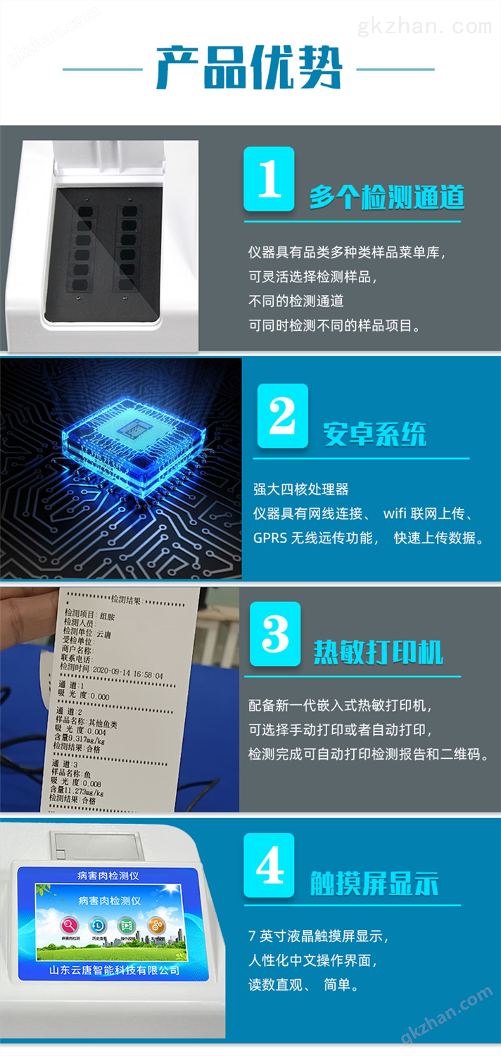 | 儀器采用手提式一體化系統(tǒng)檢測技術(shù),將分光光度模塊、新型農(nóng)殘檢測模塊、數(shù)字化管理模塊、無線通訊模塊高度集成于一體,支持檢測200種食品安全檢測項目,同時預(yù)留升級檢測方法。 | 儀器檢測模塊標(biāo)準(zhǔn)化、智能化,檢測項目可隨意自由組合。檢測箱體內(nèi)置多個標(biāo)準(zhǔn)檢測單元,檢測模塊可以調(diào)整配置。 | 顯示屏幕:儀器采用10.1英寸豎向液晶觸摸屏顯,搭配運行安卓智能操作系統(tǒng),主控芯片采用ARM Cortex-A7,RK3288/4核處理器,主頻1.88Ghz,操作方便,性能更強。 | 檢測通道:≥12通道;采用精密旋轉(zhuǎn)比色池設(shè)計,使用同芯片同光源校準(zhǔn)精度,解決不同光源之間的誤差值,更加準(zhǔn)確高效。(1-12通道間*.1%,號:ZL.2) | 儀器光源:高精度進口四波長冷光源,每個通道均配置 410、520、590、630nm 波長光源,標(biāo)配*的光路切換裝置,光路切換功能可實現(xiàn)64波長,并且所有檢測項目可實現(xiàn)所有通道同時檢測。 | 設(shè)備可一鍵校準(zhǔn),自動保存校準(zhǔn)數(shù)據(jù),自動對比校驗,得到精準(zhǔn)光源,采用Android SP存儲數(shù)據(jù),光源數(shù)據(jù)丟失,方便每一次使用。 | 通訊接口:配備無線通信模塊、4G(APN)通訊模塊、藍牙傳輸,同時具有雙USB接口以及RJ45網(wǎng)線接口,可以多方式實現(xiàn)數(shù)據(jù)保存及數(shù)據(jù)傳輸 | 存儲方式:支持U盤存儲,標(biāo)準(zhǔn)USB接口,免驅(qū)動安裝。檢測結(jié)果存儲容量20萬條以上,可生成Excel表格進行拷貝,并具有登錄保護功能。 | 智能化操作系統(tǒng): | 1)操作系統(tǒng):儀器可在同一檢測界面自動對應(yīng)相關(guān)檢測通道,一次性選擇1-12個樣品名稱,無需退出界面,節(jié)省操作時間。并可以對每個通道屬性和樣品信息單獨進行編輯,例如送檢單位、人員,檢測人員等,打印時勾選打印顯示。 | 2)數(shù)據(jù)集成系統(tǒng):設(shè)備首頁自動匯總分析檢測數(shù)據(jù),包含:周檢測數(shù)據(jù)、月檢測數(shù)據(jù),全部檢測總數(shù)量,均包含檢測總數(shù),合格數(shù),不合格數(shù),以及相關(guān)柱形分析圖,各項檢測數(shù)據(jù)一目了然,無需電腦查詢,更加快捷直觀。 | 3)數(shù)據(jù)庫系統(tǒng):十幾項數(shù)據(jù)庫分類管理儀器:包含項目類型、項目數(shù)據(jù)、檢測數(shù)據(jù)、歷史記錄、國標(biāo)信息、曲線信息、采樣信息、檢測信息、受檢信息、復(fù)核信息、圖表信息、光源校準(zhǔn)信息、打印樣式信息、樣品庫信息等等,數(shù)據(jù)庫之間互相協(xié)調(diào)聯(lián)動保證數(shù)據(jù)的真實完整性。同時產(chǎn)品數(shù)據(jù)庫以及歷史檢測記錄支持一鍵檢索功能。 | 4)規(guī)判系統(tǒng):具有查詢、添加物質(zhì)合規(guī)判定系統(tǒng)。檢測出結(jié)果后,系統(tǒng)自動調(diào)用系統(tǒng)數(shù)據(jù)庫中相關(guān)國標(biāo)進行比對判定,客觀顯示判定結(jié)果是否合格。 | 5)項目預(yù)設(shè)系統(tǒng):儀器具有任務(wù)預(yù)設(shè)模塊,一鍵提前預(yù)設(shè),給出方便快捷的新檢測方案,每一個任務(wù)分別可以設(shè)置不同的樣品、批次、編號、來源、備注、抽樣信息、檢測信息、受檢信息、復(fù)核信息等更多信息。樣品送檢時一鍵調(diào)取保存信息,并可多次調(diào)取,大大提高檢測效率。 | 6)數(shù)據(jù)監(jiān)管系統(tǒng):同步對接監(jiān)管平臺,數(shù)據(jù)可局域網(wǎng)和互聯(lián)網(wǎng)數(shù)據(jù)上傳,檢測結(jié)果可選擇直接傳至食品安全監(jiān)管平臺。進行區(qū)域食品安全監(jiān)管及大數(shù)據(jù)分析處理與數(shù)據(jù)統(tǒng)計,檢測區(qū)域食品安全長短期動態(tài),達到食品安全問題預(yù)估、預(yù)警。 | 7)打印系統(tǒng):內(nèi)置全新打印機,新創(chuàng)自定義打印方式,可按需靈活勾選控制:產(chǎn)品合格證(國家標(biāo)準(zhǔn)要求),二維碼,抽樣信息、檢測信息,受檢信息、復(fù)核信息、抽樣日期、檢測日期等信息的打印。 | 供電模式:儀器交直流兩用,直流12V供電,可連接車載電源,可配6ah大容量充電鋰電池,電量可實時顯示,方便戶外流動測試。 | 膠體金檢測模塊:采用雙通道CMOS成像處理技術(shù)及膠體金免疫層析技術(shù),可同時讀取雙膠體金卡數(shù)據(jù),自動采集、處理分析,將檢測結(jié)果顯示,并可根據(jù)參考限值自動判斷檢測結(jié)果,可檢測常見的獸藥殘留、生物毒素、抗生素、違禁添加物等。 | 1)探測技術(shù):CMOS成像探測; | 2)檢測通道:1個通道; | 3)檢測方式:消線法和比色法; | 4)顯示模式:陰性或陽性; | 5)曲線形式:軌道式掃描方式,顯示金標(biāo)卡圖像,實時生成、識別CT曲線圖,無需手動調(diào)整,完成檢測后自動退出檢測卡。兼容市場上其他金標(biāo)卡,使用耗材不受限制。 | 儀器加入遠程升級功能,可定向分客戶分儀器更新,開機后自動更新,客戶無需任何操作,即可升級全新項目。做到了無需退換機器即可實現(xiàn)實時遠程升級檢測儀器。 |